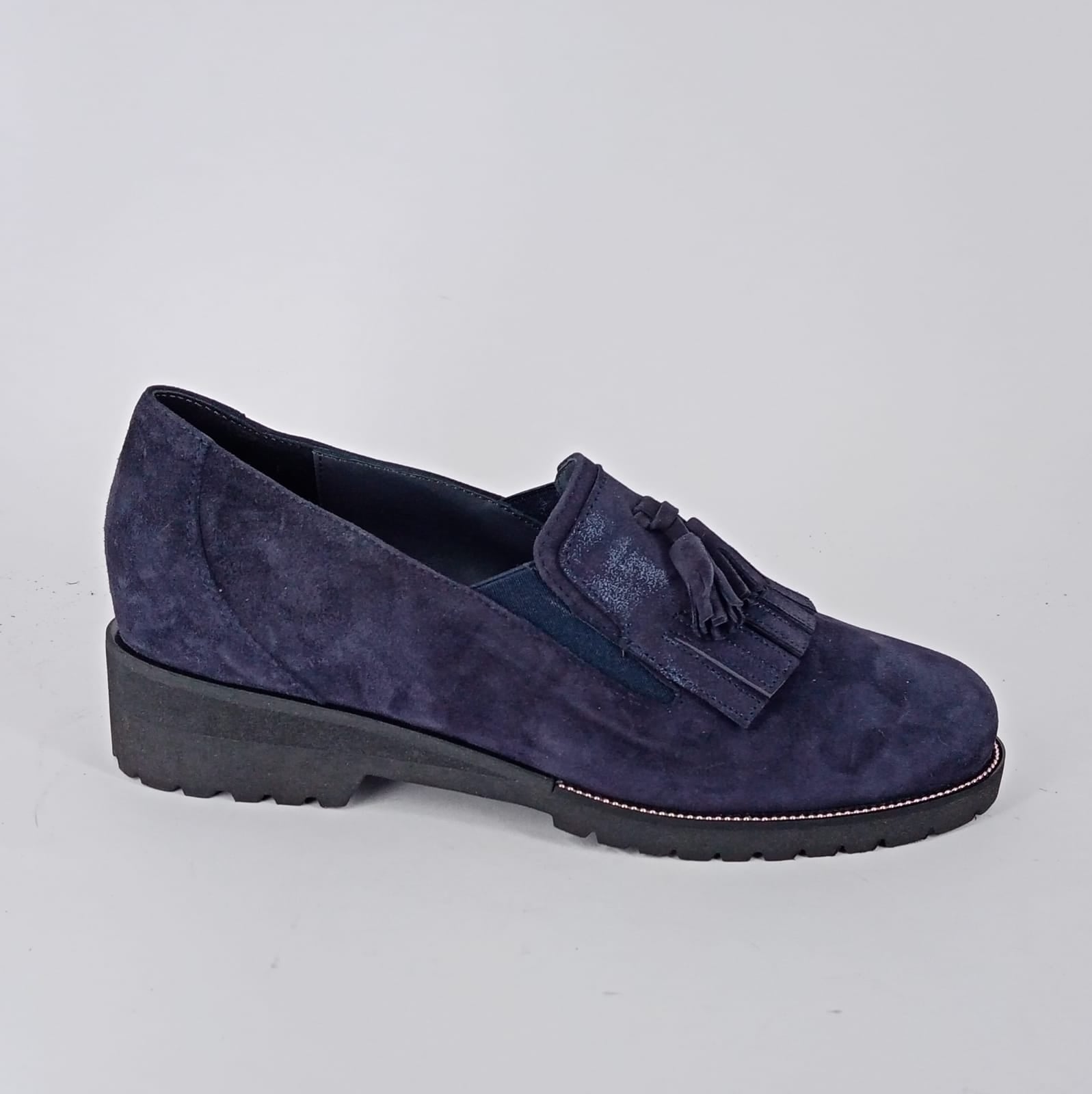 Maral shoes - Mocassino blu in camoscio con frangia.