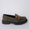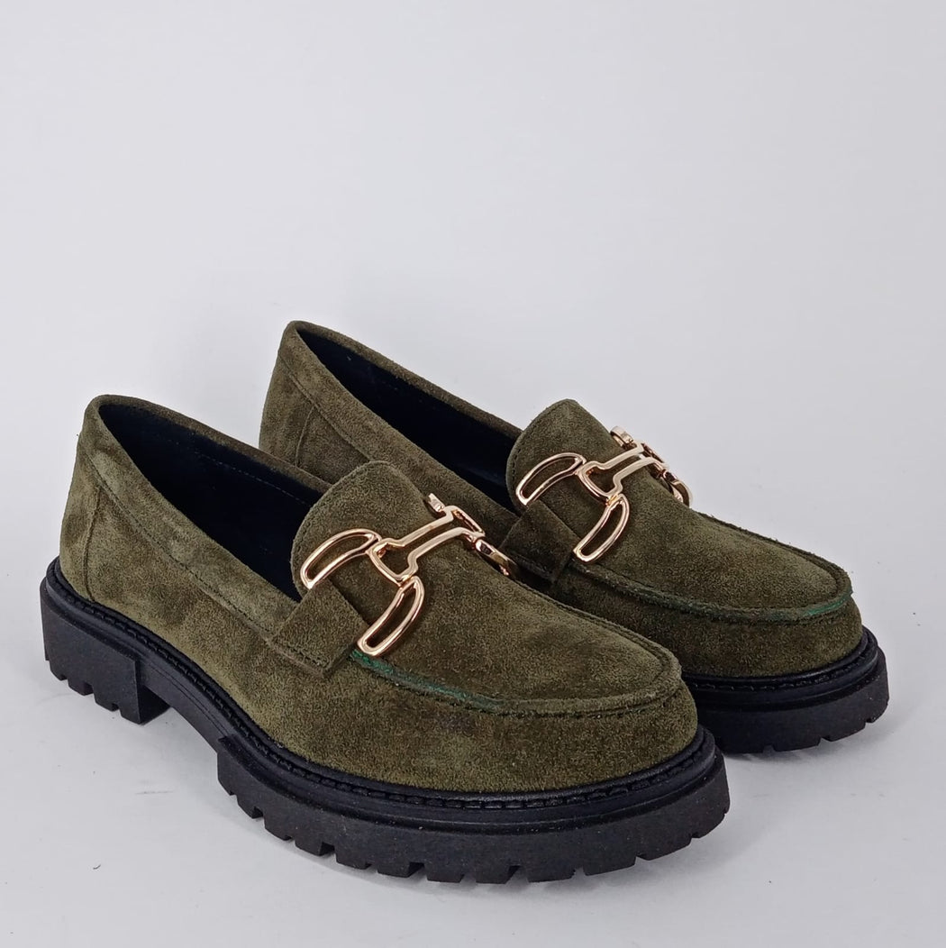 Mocassino in camoscio verde oliva con morsetto in metallo. Fodera in pelle. Sottopiede in pelle imbottito. Suola carro in gomma leggera.