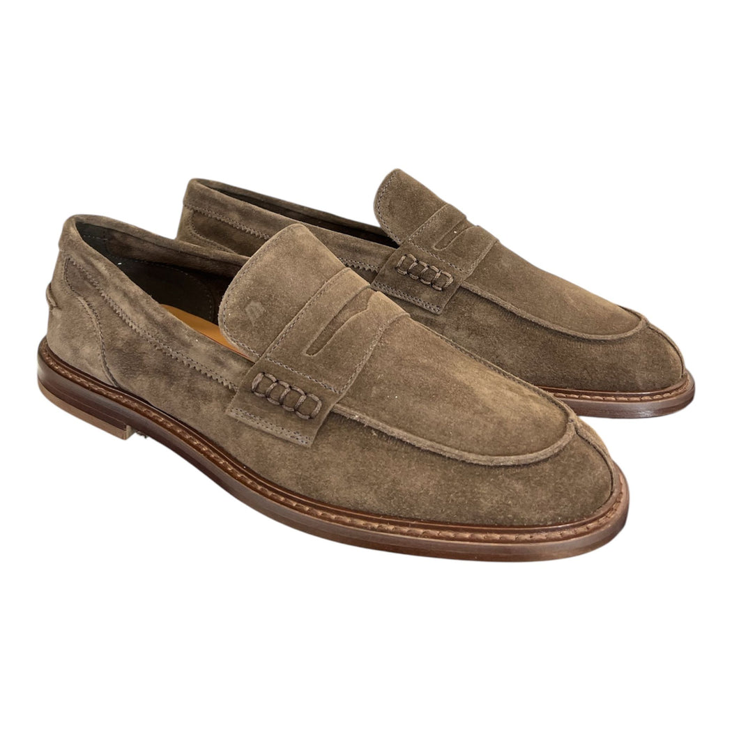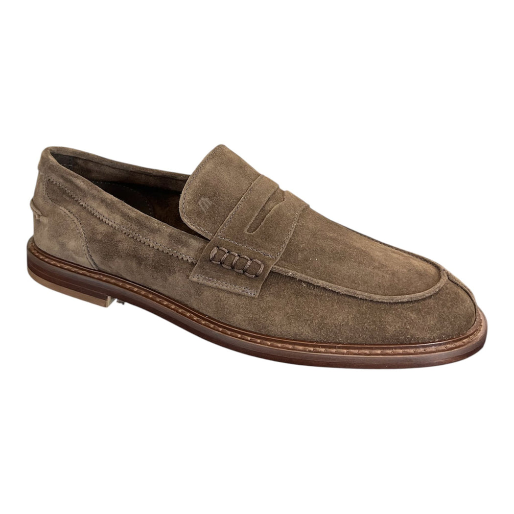Mocassino uomo in pelle scamosciata marrone con suola in cuoio. Interno semi foderato in pelle. Sottopiede in cuoio, materiale naturale dalle note proprietà traspiranti, con mezza tallonetta in pelle. Suola in cuoio con guardolo cucito. Vestibilità standard. Made in Italy.