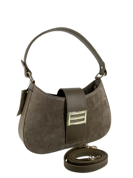 Borsa in camoscio tortora. Patta in pelle liscia con una fibbia decorativa rettangolare dorata, prima chiusura con zip seconda chiusura con bottone magnetico. Scomparto principale molto capiente. Tasca interna laterale con chiusura a zip.
