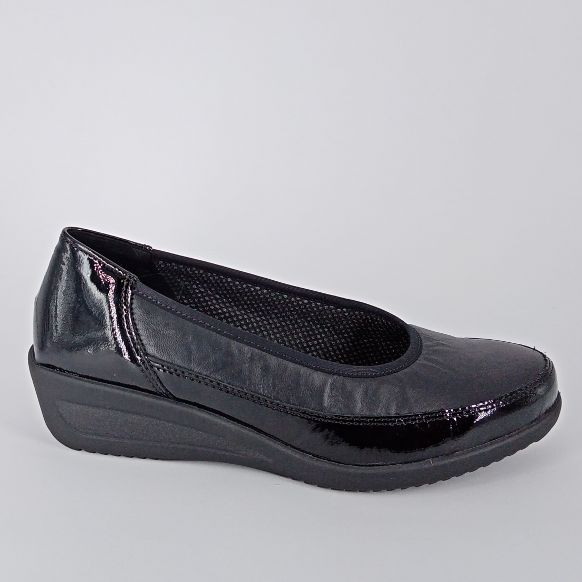 Decoltè classico sportivo in pelle e vernice nera con zeppa di cm. 4 in gomma antiscivolo. La fodera e il sottopiede estraibile sono in tessuto tecnico e caldo.
