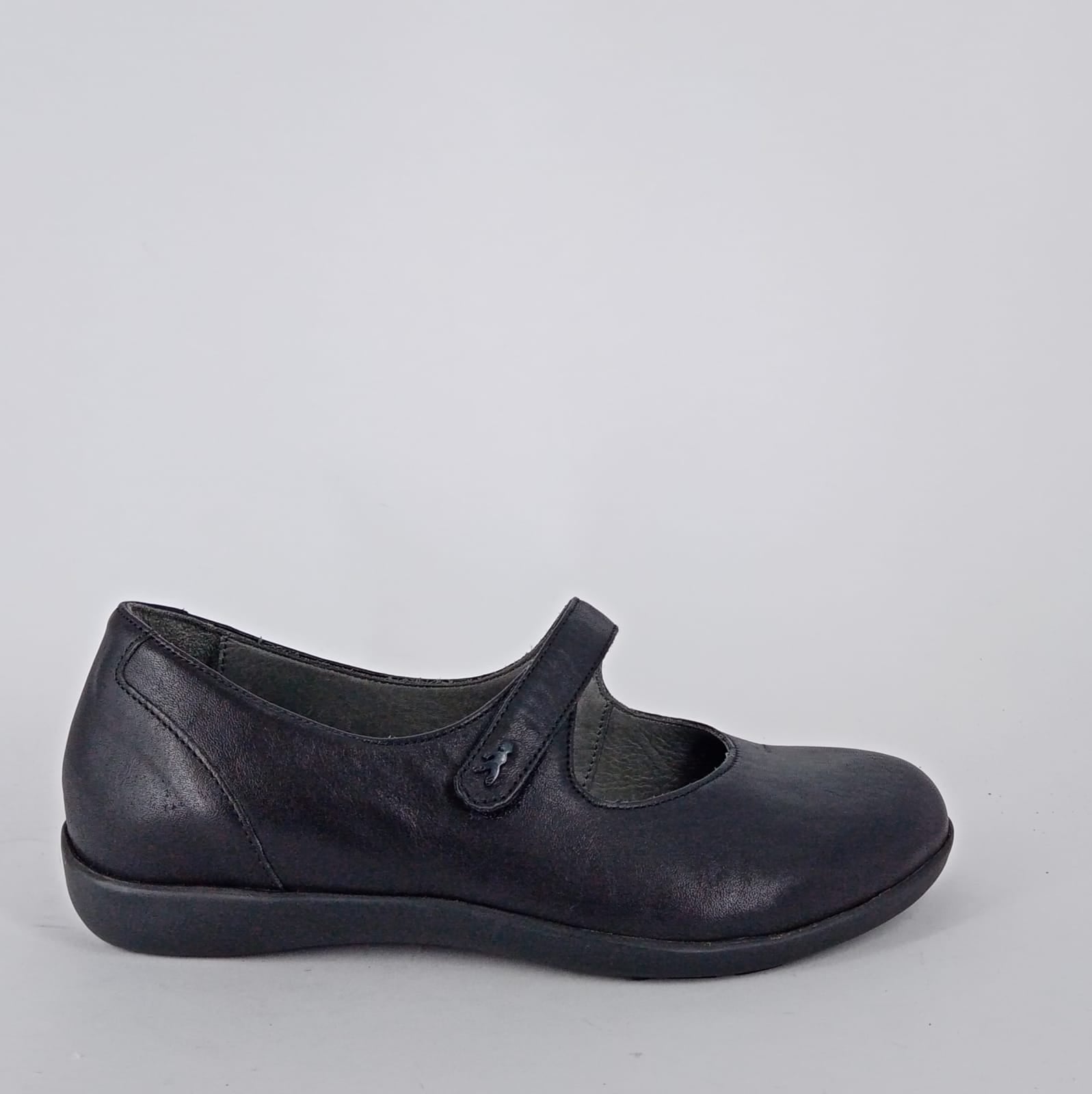 Decolletè in pelle nera con cinghia . La fodera è in pelle e il plantare estraibile è foderato in pelle . Suola in gomma con anti grip .