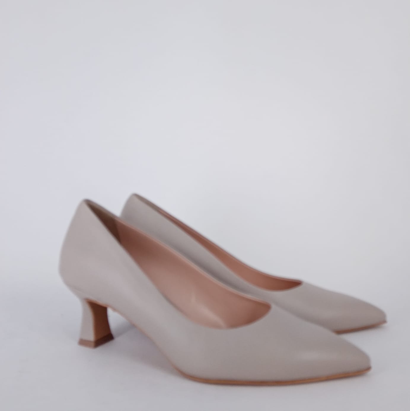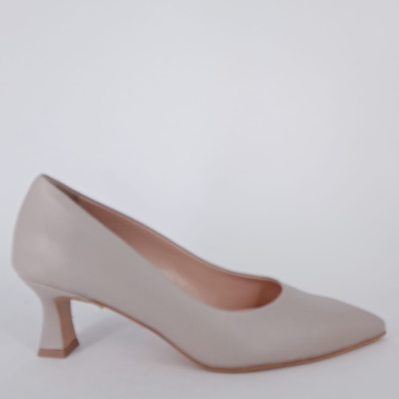Decollete in morbida pelle color sasso. Fodera in pelle e sottopiede imbottito . Tacco rivestito, altezza cm. 5,5 . Punta sfilata con calzata comoda e pianta larga, adatta anche a piedi difficili e con alluce valgo.