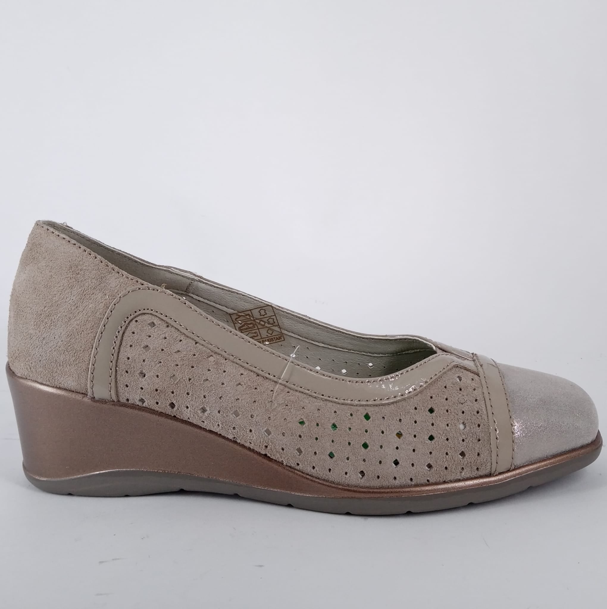 Decolletè donna in pelle beige con inserti in ecopelle lucida. Tomaia traforata. Interno foderato per un comfort superiore. La suola è una zeppa comoda con altezza tacco cm 5.