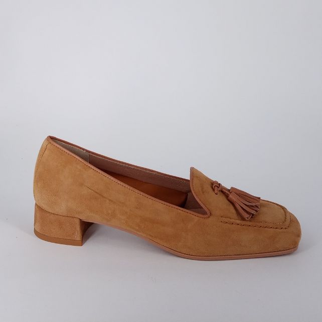 Cinzia Valle . Mocassino in camoscio tabacco con nappine . Mezzafodera e sottopiede imbottito in pelle . La suola è in cuoio con il tacco di cm. 3,5. Calzata normale . Lavorazione made in Italy .