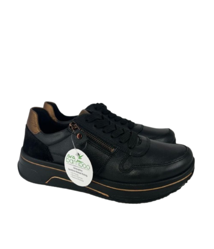 Sneakers donna in pelle nera. Fodera interna in base di bambù. Pratica cerniera esterna. Suola a zeppa con leggero plateau. Sottopiede estraibile.