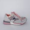 Cafenoir . Sneaker in camoscio ghiaccio e riporti laminato silver e tessuto fantasia rosa e grigio . Sottopiede estraibile morbido in lattice rivestito in tessuto . Suola in gomma colorata grigio , rosa e bianco di cm.2,5 . Calzata normale .