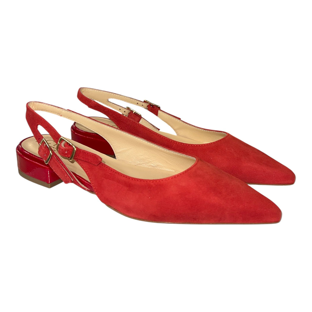 Slingabck donna in pelle scamosciata rossa con scolatura a V. Sottopiede morbido. Punta sfilata con calzata comoda adatta anche a piedi difficili o con allluce valgo . Chiusura con due cinturini. Altezza tacco di 2,5 cm.