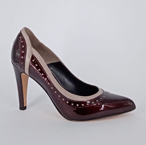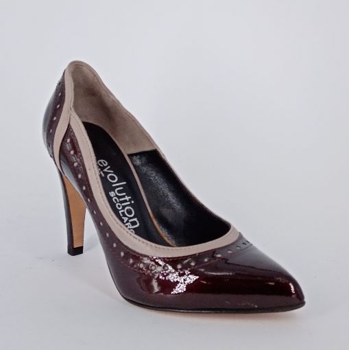 Decolte' in vernice bordo' con riporti di pelle beige .Fodera e sottopiede in pelle . Tacco di cm 9 foderato in vernice . Suola in cuoio . Calzata per piedi sottili .