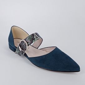 Lotti . Ballerina in camoscio blu con cinghia pitonata blu . Fodera e sottopiede imbottito in pelle . Suola in gomma flessibile . Cod. 521017 .