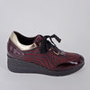 Sneakers in pelle zebrata bordò e nera con riporti in vernice bordò e pelle platino . La fodera è in tessuto tecnico e caldo . Sottopiede estraibile . Suola in gomma antiscivolo con zeppa di cm. 5 .