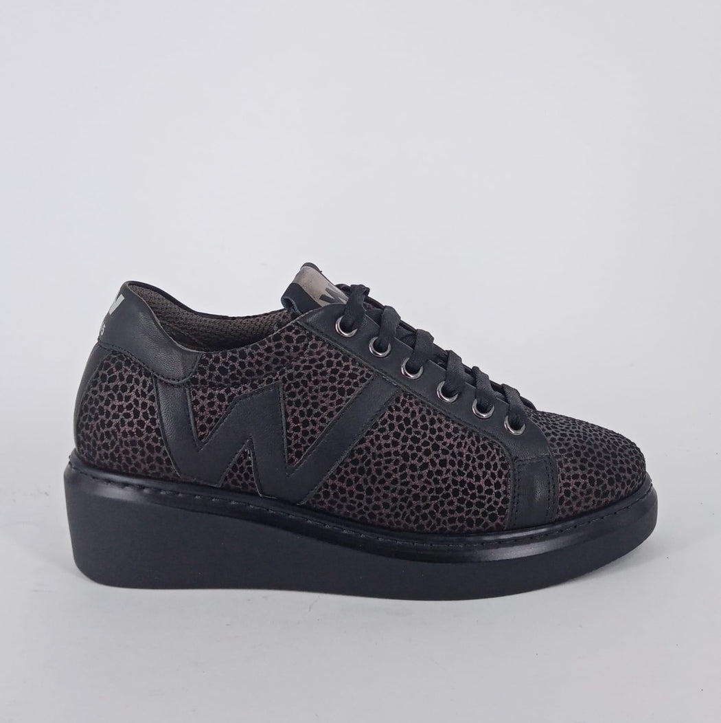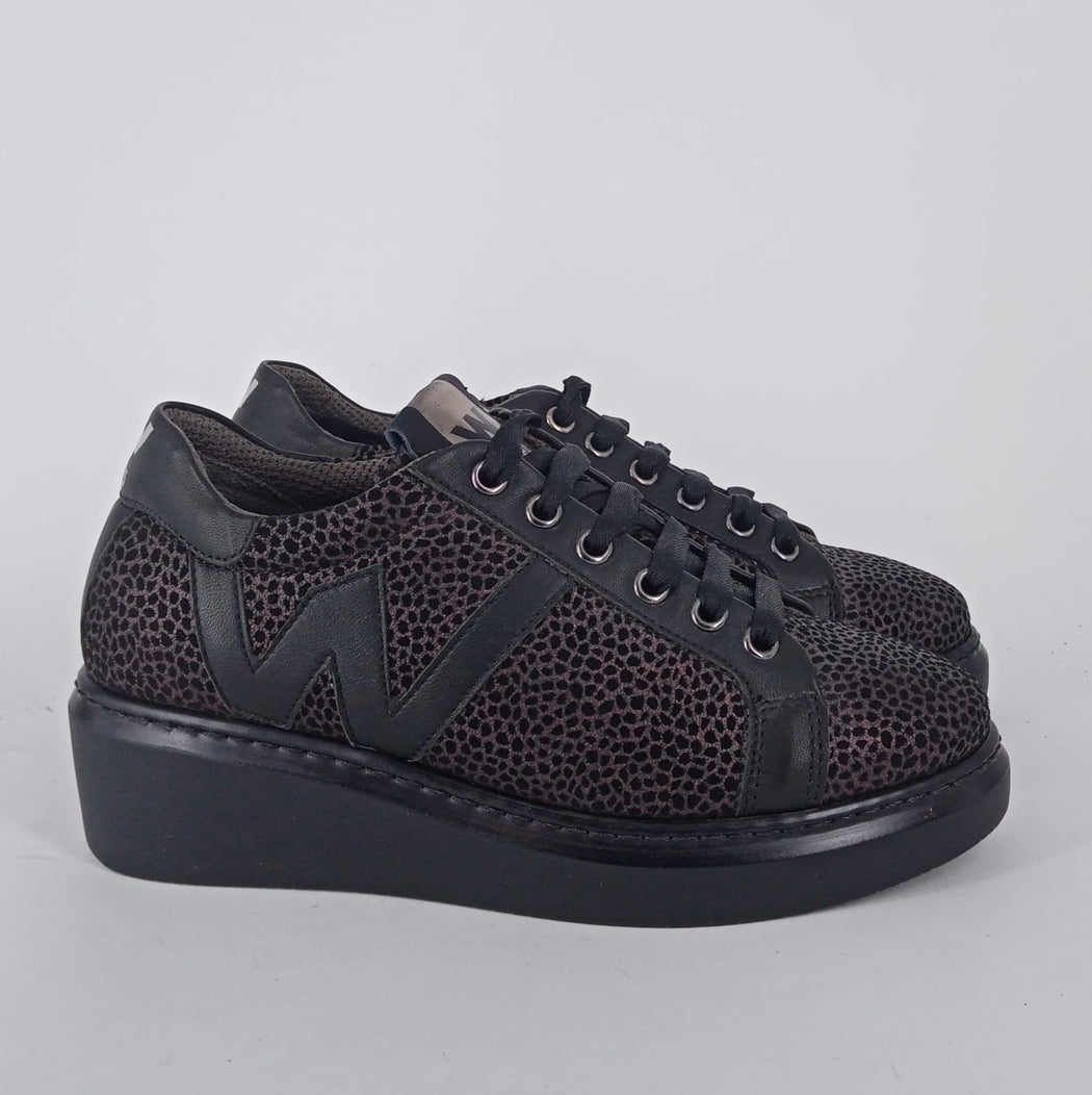 Sneakers allacciata in pelle nera e marrone con logo W laterale di MELLUSO. Fodera di tessuto tecnico.  Sottopiede foderato in pelle, estraibile in TECHNO MEMORY. Suola in gomma alta cm 4,5.
