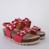 Sandalo donna in pelle rosso con pietre decorative. Chiusura regolabile dalla doppia fascia in velcro e cinturino posteriore con fibbia. Suola in sughero con base in gomma beige. Altezza zeppa cm 5. Cod: 018148