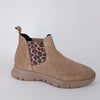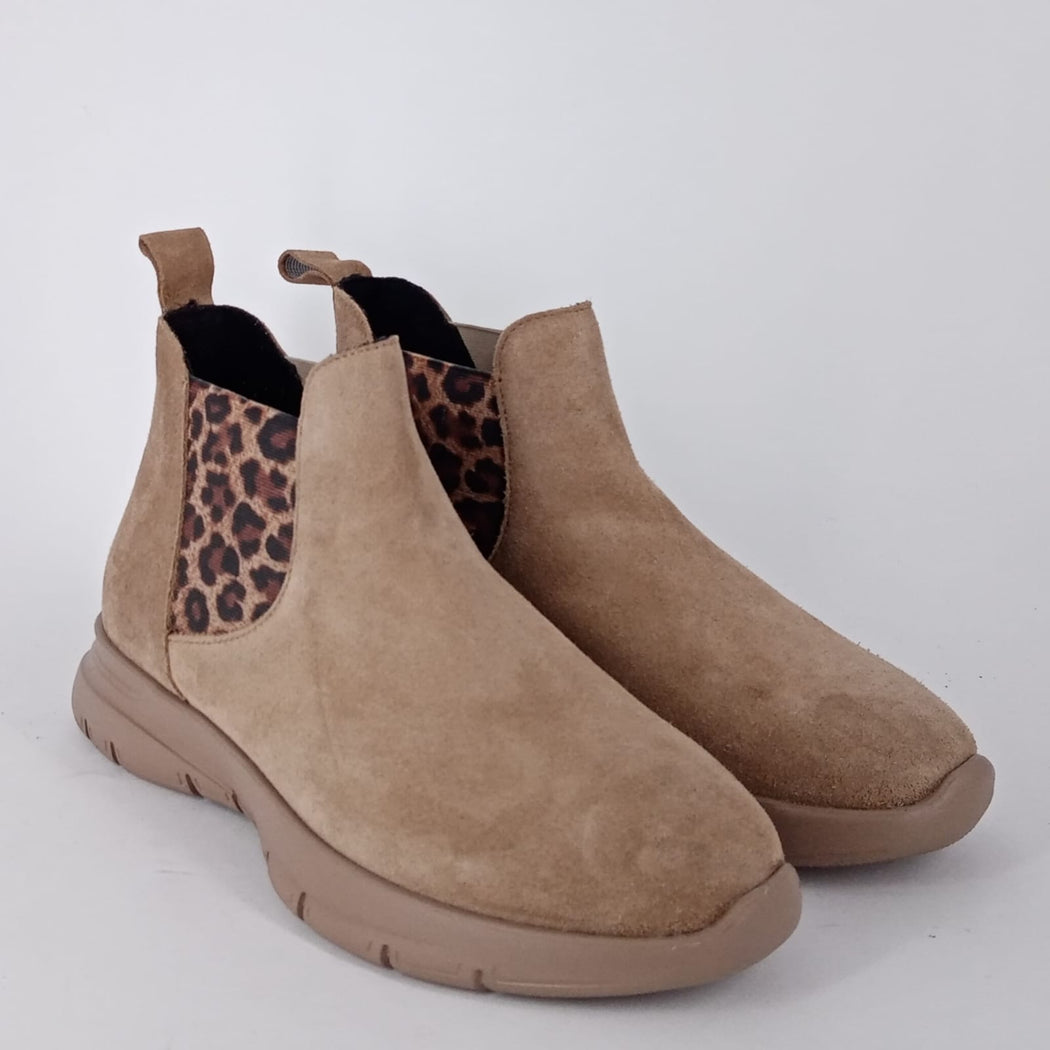 Stivaletti in camoscio beige. Doppia fascia elastica laterale animalier. Fodera in tessuto termico. Plantare estraibile in tessuto. Suola extralight in gomma. Calzata comoda Cod: 43C5