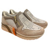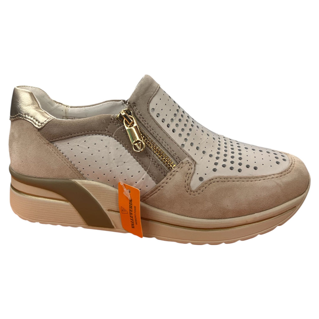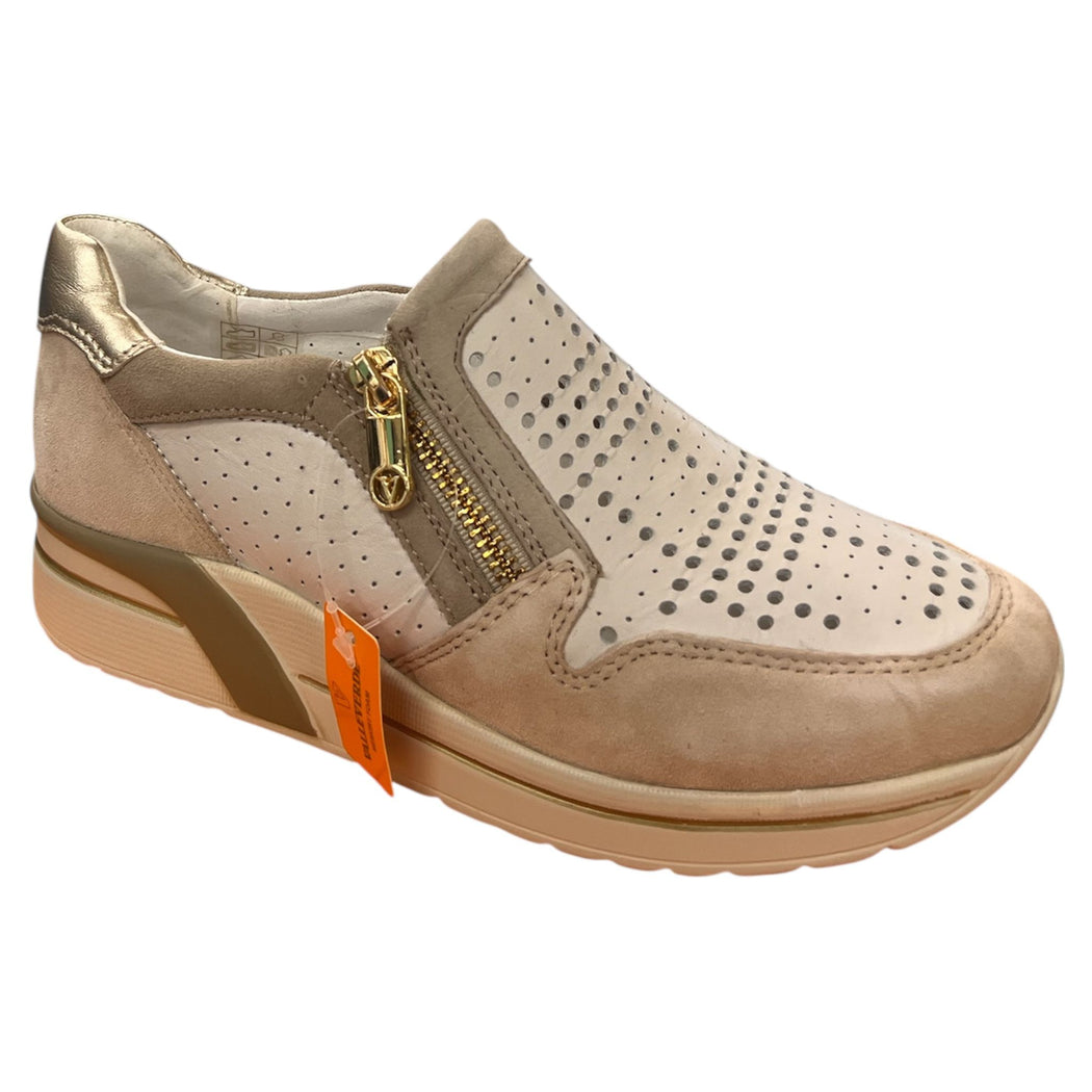 Sneakers donna in pelle traforata e camoscio beige e bianco. Cerniera e elastico laterale per facilitare la calzata. Suola leggera alta cm 3.