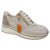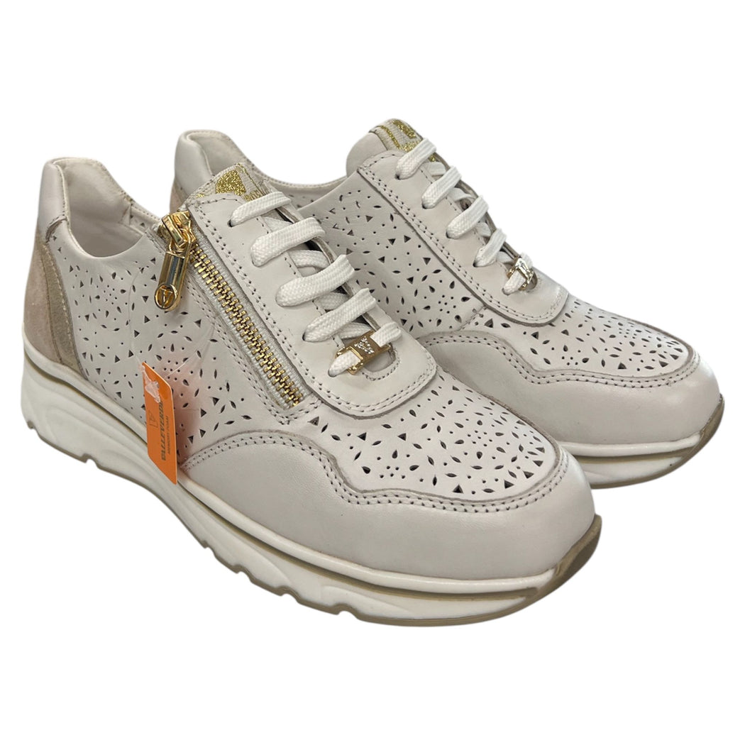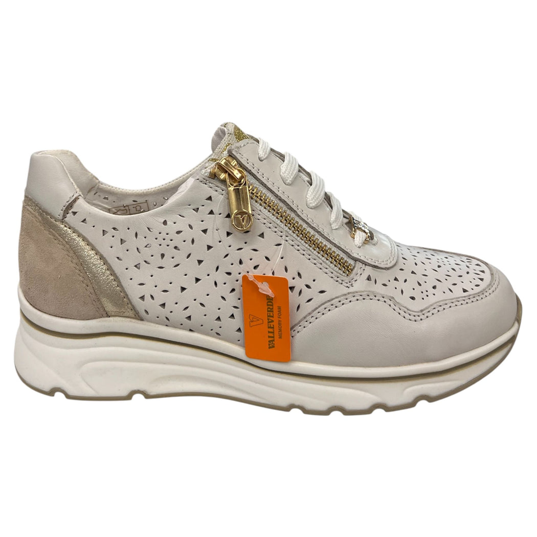 Sneakers donna in pelle traforata con un elegante motivo geometrico, arricchita da inserti in camoscio sul tallone . Doppia cerniera laterale per facilitare la calzata. Plantare in pelle estraibile per garantire il massimo comfort durante la camminata. Suola leggera alta cm 3,5. Cod:36061